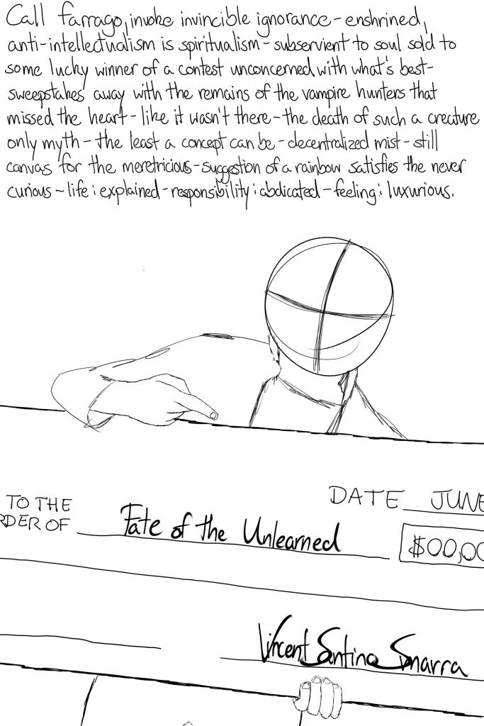 Call farrago, invoke invincible ignorance – enshrined, anti-intellectualism is spiritualism – subservient to soul sold to some lucky winner of a contest unconcerned with what’s best – sweepstakes away with the remains of vampire hunters that missed the heart – like it wasn’t there – the death of such a creature only myth – the least a concept can be – decentralized mist – still canvas for the meretricious – suggestion of a rainbow satisfies the never curious – life: explained – responsibility: abdicated – feeling: luxurious.