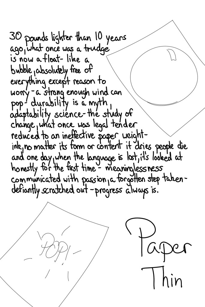 30 pounds lighter than 10 years ago, what once was a trudge is now a float – like a bubble, absolutely free of everything except reason to worry – a strong enough wind can pop – durability is a myth, adaptability science – the study of change, what once was legal tender reduced to an ineffective paper weight – ink, no matter its form or content it dries people die and one day, when the language is lost, it’s looked at honestly for the first time – meaninglessness communicated with passion, a forgotten step taken – defiantly scratched out – progress always is.