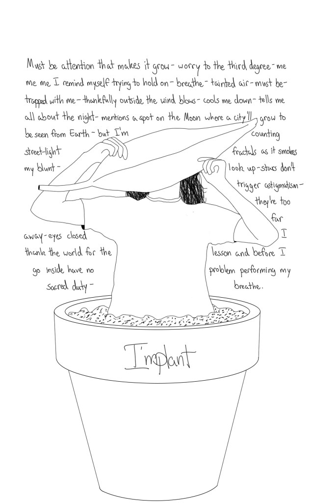 Must be attention that makes it grow – worry to the third degree – me me me I remind myself trying to hold on – breathe – tainted air – must be – trapped with me – thankfully outside the wind blows – cools me down – tells me all about the night – mentions a spot on the Moon where a city’ll grow to be seen from Earth – but I’m counting street-light fractals as it smokes my blunt – look up – stars don’t trigger astigmatism – they’re too far away – eyes closed I thank the world for the lesson and before I go inside have no problem performing my sacred duty – breathe.